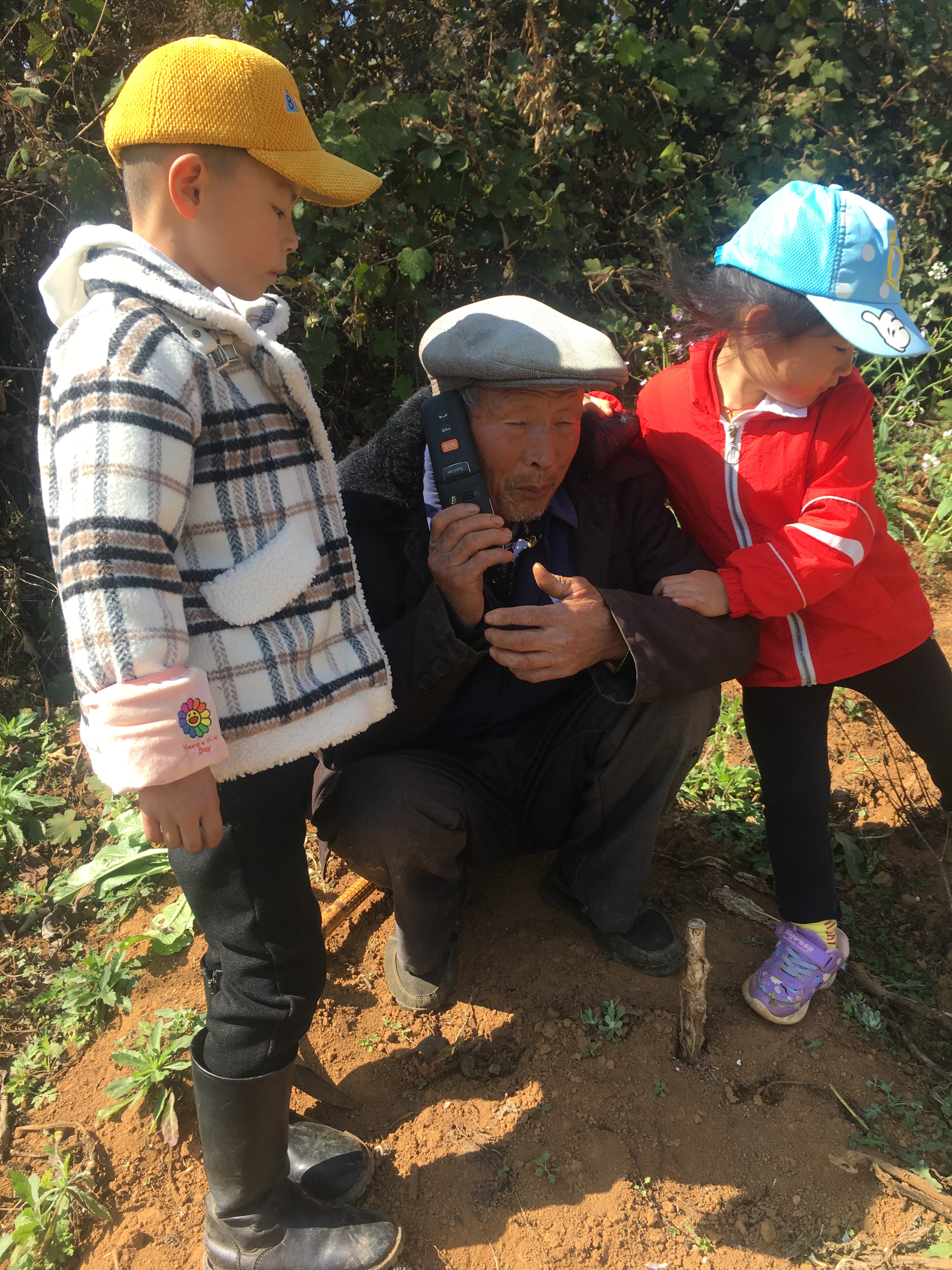 作者:和根吉;照片主题为:文山县平坝镇牛坡背村农民第一次用上了信号通畅的电话,闭上眼睛,以为在做梦,不敢相信是真的。