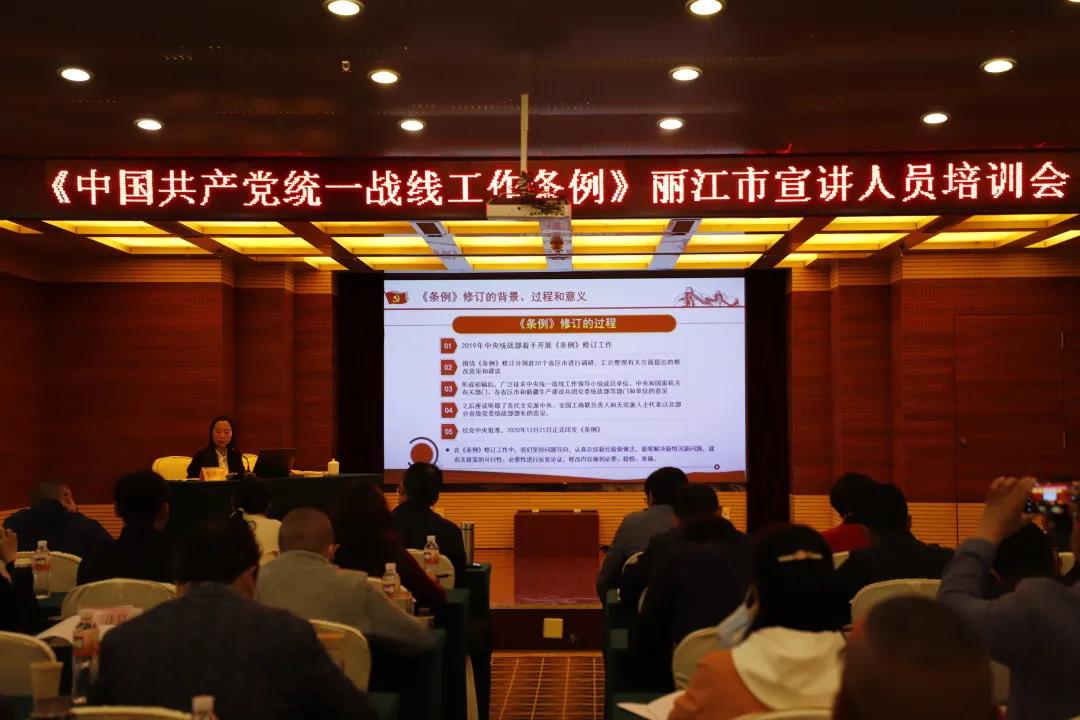 2021年4月29日上午,丽江市委统战部为深入学习贯彻《中国共产党统一战线工作条例》(以下简称《条例》)精神,进一步安排部署全市《条例》学习宣讲任务,培训一批《条例》宣讲员,举办了《条例》宣讲人员培训会。市委统战部常务副部长李智义主持宣讲会并讲话,部务委员李书芹作专题宣讲解读。我校教师平丹参加了此次培训会。