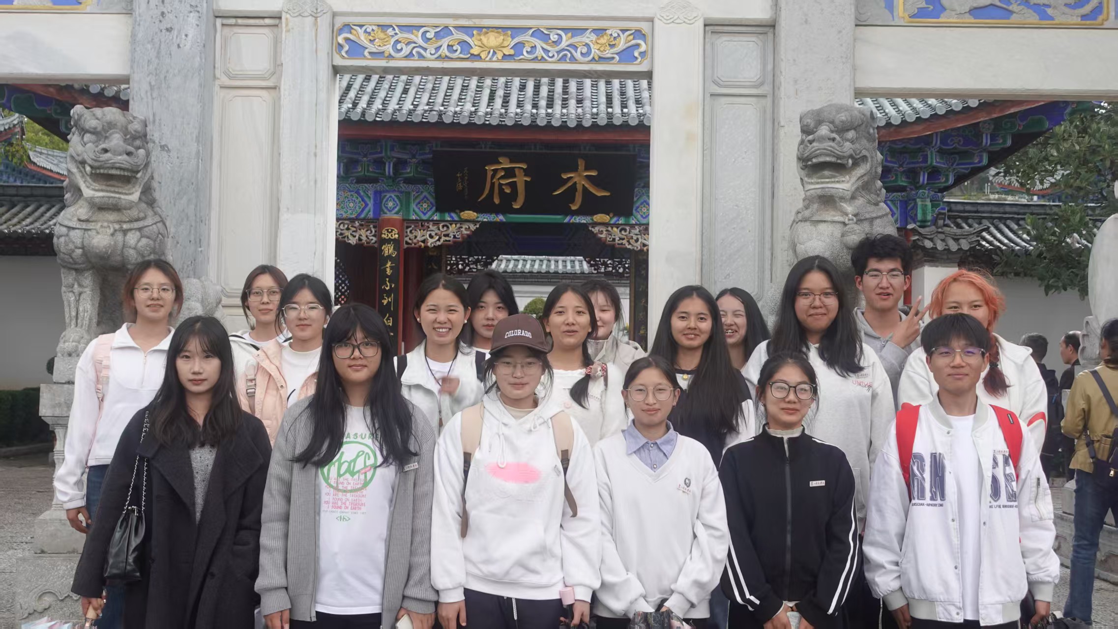 下午一点三十分,队员们于学校东门口集合完毕。雨水纷飞,浇不灭澎湃的心,欢声笑语盈满车厢。两点左右,队员们陆续抵达木府博物院门口,拍下合照。彼时,旁边有几位外国友人经过,大家互相打起了招呼,在一片欢笑声中,大家合影留念。“茄子!”照片定格住了大家的笑脸。